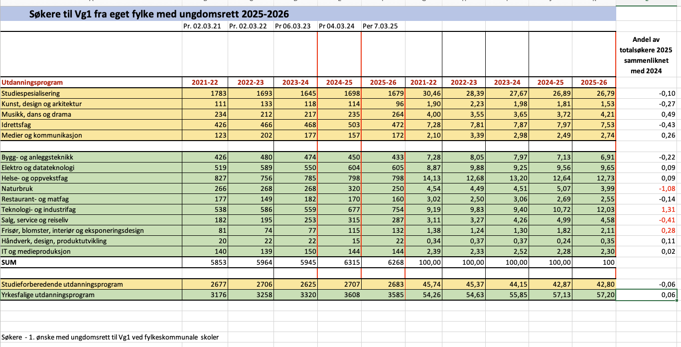 | Utdanningsprogram | 2024/ 2025 | 2025/ 2026 | 2024/ 2025 % | 2025/ 2026 | Totalsøkere sammenliknet med 2024 |